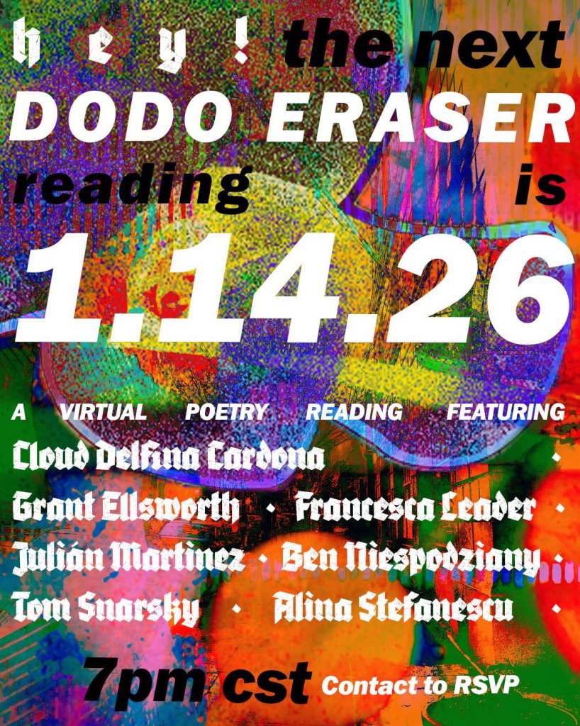 If you would like to attend, please contact us on Twitter @dodo_eraser or email dodoerasermag@gmail.com to request the link with “Reading Request” in the subject. For those who can’t attend, an upload of the reading will be available next month. Similarly, recordings of our earlier readings will be made available in the coming days.